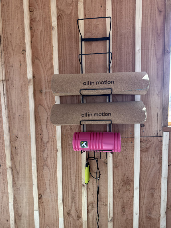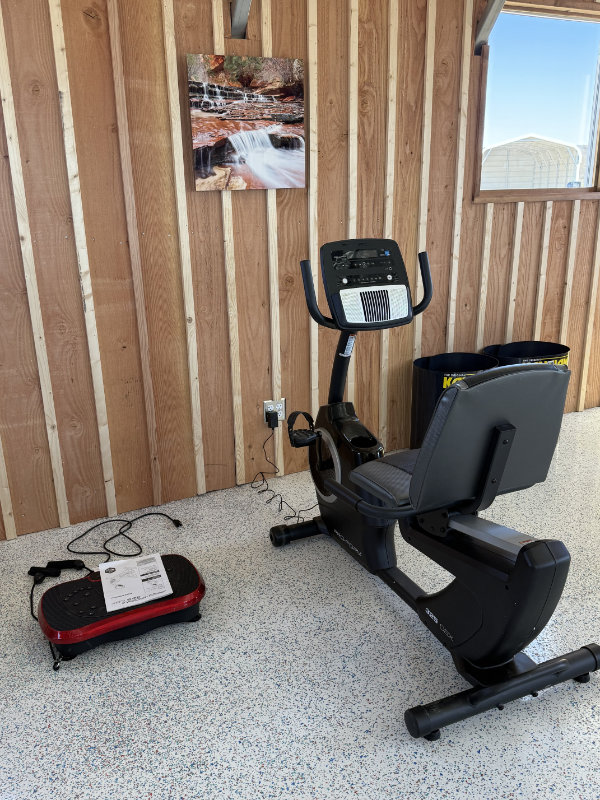 - Exercise equipment: free weights, stationary bike, yoga mat